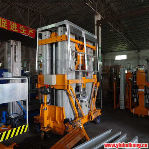 大型升降机械设备之四桅柱式铝合金升降机具有非常强的铝合金升降桅柱系统,铝合金升降部分的特征是:拥有四条高强度的铝型材桅杆,采用矩形相互环绕扣锁的方式,可以伸缩的桅柱安全系数大小于10:1的起重链,升降机桅杆两边设有钢丝保护系统,可用来加强升降机力度及可靠的稳定性能,其焊接式的钢结构底座适合于恶劣的工作环境,坚固并且防各种碰撞。适合于其他铝合金升降机不能达到的高空作业,四桅杆举升,最高工作高度可达24米,最大载重200KG左右,升降作业时平稳,安全坚固,配备有液压翻转架,可用于标准通道门的进出。
